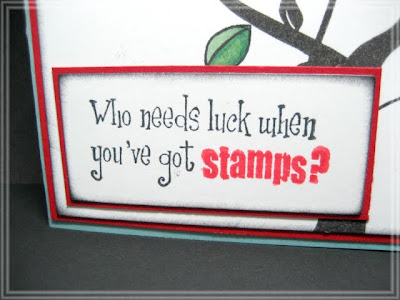 For today's card, i decided to play a little bit. I very rarely do CAS cards. I usually think that something is missing and it just doesnt feel right. But for this card, i used one of the new sentiments (which is actually 2 separate stamps). The sentiment reads "who needs luck when you've got..." and then there is a slew of words you can stamp in there. I chose STAMPS!?
